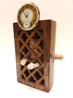 In a long ago post I mentioned a piece that had some technical issues which needed to be addressed. Using a shelf mocker box with corresponding mocking ceramic head and arms, I worked this piece until the stumbling block of how to attach the hands to the wire mechanical movement came into play. And there it sat...for months. I knew I had to get past the blue painters tape, the arms were falling off by this point. Having tried to drill a tiny hole through the arm, nope, then simply wrapping wire around the arm, again nope, it was time to try 2 part epoxy. I felt this was the last resort because if I mess up the mixing process or attach the hands in the wrong position, or as in the past, have the piece shift while drying becoming non functional, having only one set of hands kept me from moving forward. As you can see I had some reservations. As it often happens, the piece spoke and I heard the lady in the box whisperer that it was time, she was ready to come out and play. I dug the epoxy out of the bottom of my stash and made my plan. The wire to attach the arms were sticking out of the appointed holes ready to be cut to length, the first commitment to make me sweat, next was filling, but not over filling the minute hole in the arm, and lastly finding a way to have the epoxy set in the correct position while hanging in open space, really sweating now. Each step attended to, now to wait.
